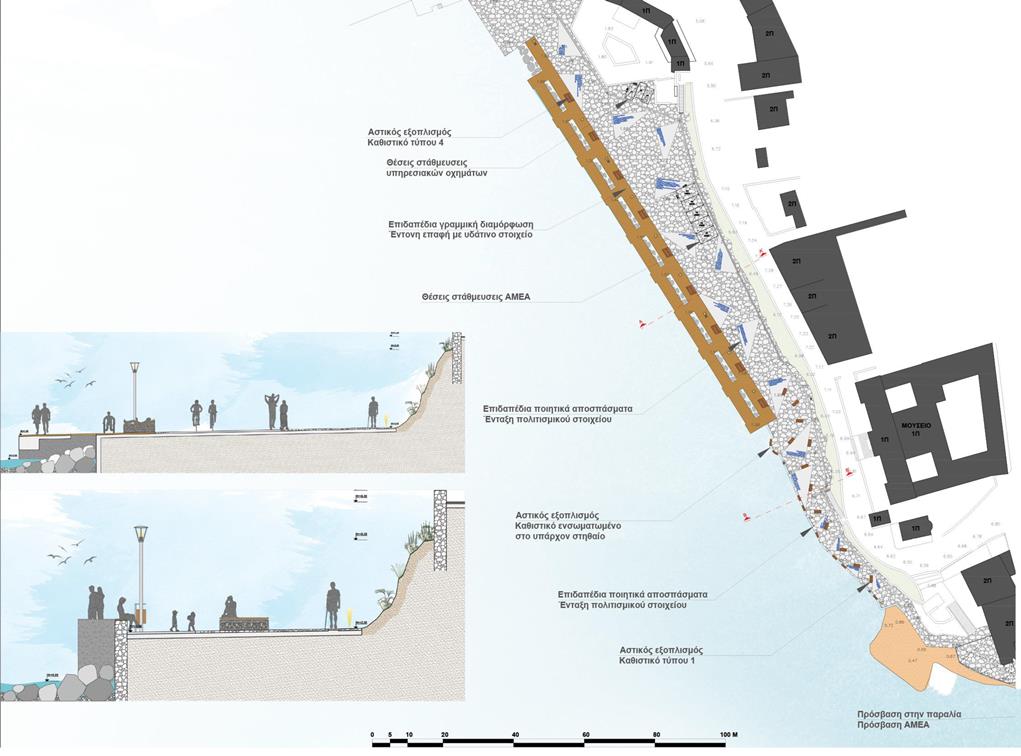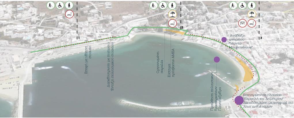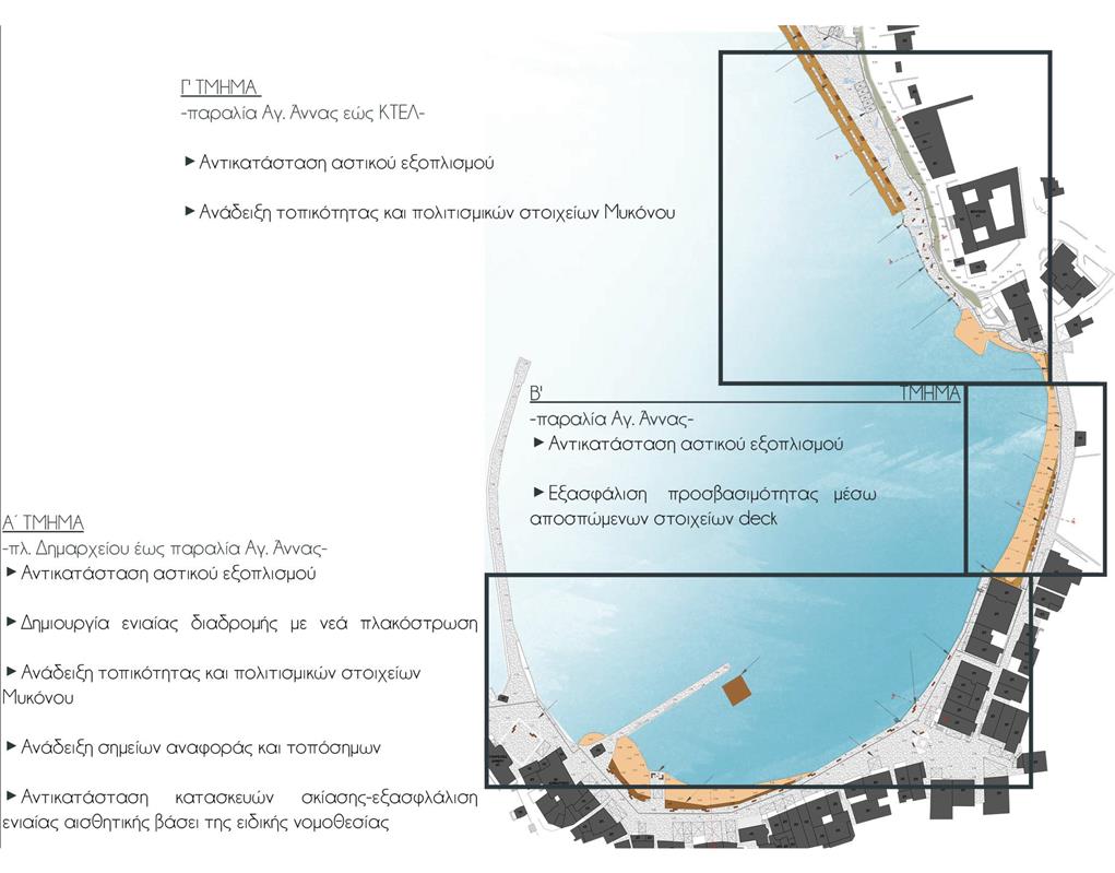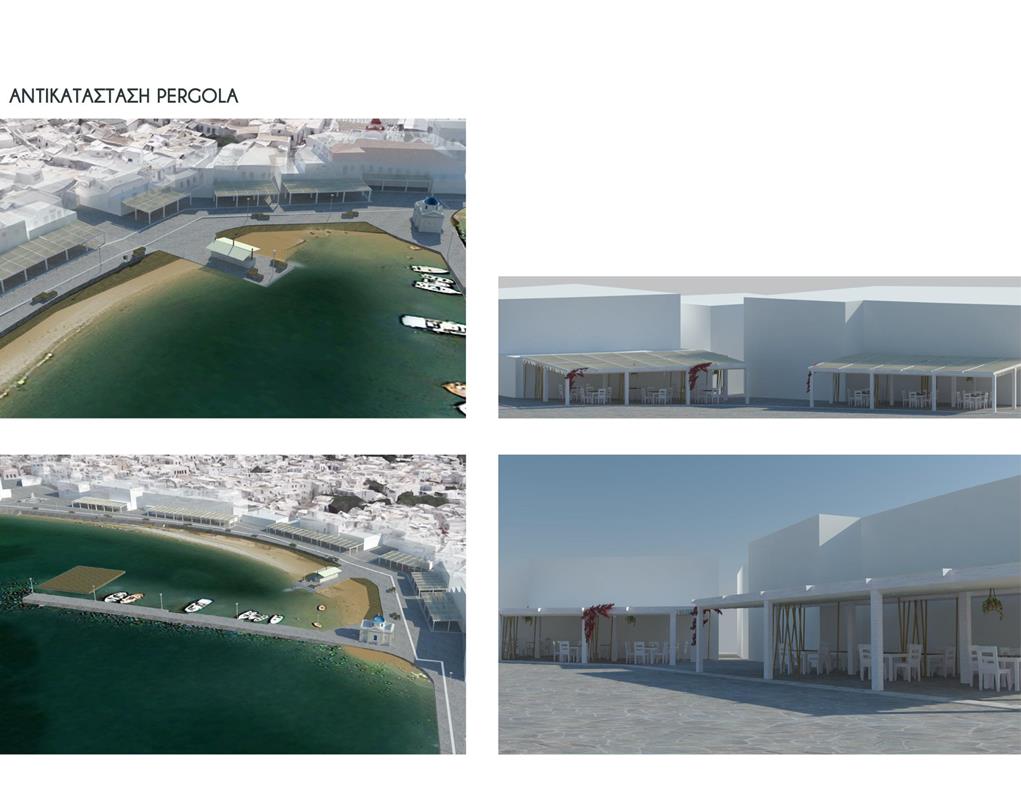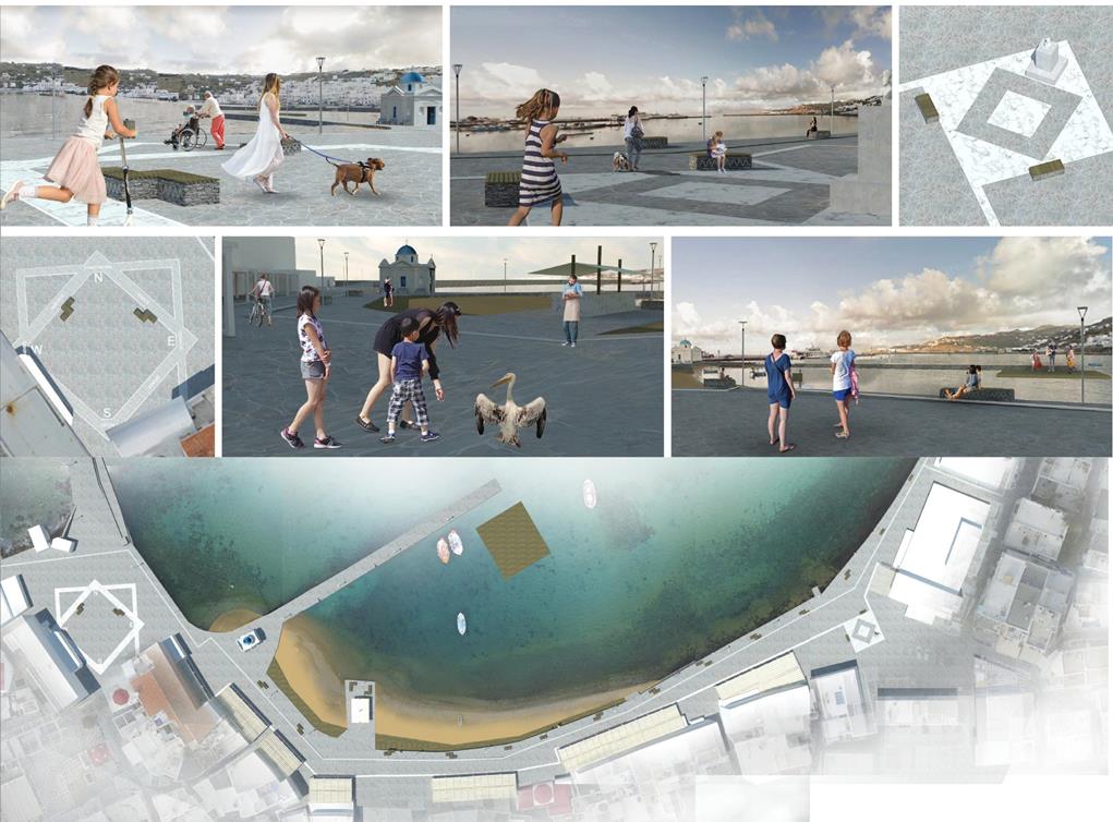 Η μελέτη επικεντρώθηκε στην αισθητική και ποιοτική αναβάθμιση της χερσαίας ζώνης του Λιμένα Μυκόνου, στη λογική της βιοκλιματικής ανάπλασης και της ενίσχυσης της βιώσιμης αστικής κινητικότητας. Οι παρεμβάσεις αφορούσαν την αποκατάσταση της υφιστάμενης πλακόστρωσης, με σεβασμό στα υφιστάμενα ποιοτικά και αισθητικά χαρακτηριστικά του μετώπου, την αποκατάσταση και ενίσχυση του αστικού εξοπλισμού, την δημιουργία άνετων χώρων στάσης και σκίασης, την προβολή της τοπικότητας και των πολιτισμικών στοιχείων της Μυκόνου, αλλά και την ανάδειξη των σημείων αναφοράς και των δημόσιων, κοινωνικών χώρων.